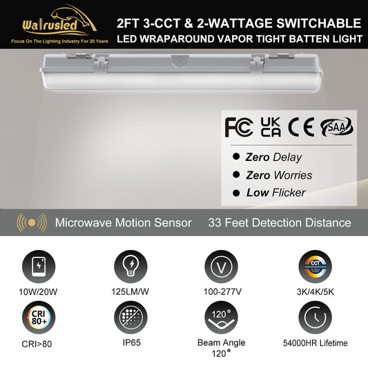 Walrusled 2FT Motion Sensor LED Wraparound Vapor Tight Batten Light, 2 Wattages/3 CCT Selectable 10W/20W 1250lm/2500lm 3000K/4000K/5000K, IP65, IK08, Dimmable 2 Foot LED Tunnel Wrap Waterproof Light Fixture, 60CM Flush Mount LED Vapor Proof Ceiling Light