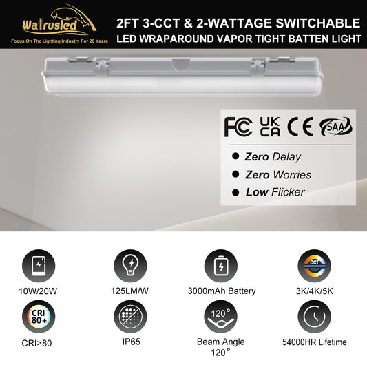 Walrusled 2FT LED Wraparound Vapor Tight Emergency Batten Light, 3 CCT Power Selectable, 10W/20W, 1250lm/2500lm, Battery Backup, 3000K/4000K/5000K, IP65, IK08, 2 Foot LED Garage Wrap Waterproof Light Fixture, 60CM Flush Mount LED Vapor Proof Ceiling Light