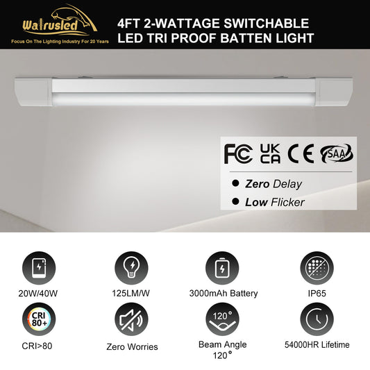 Walrusled 4FT LED Tri Proof Emergency Batten Light, Power Selectable, 20W/40W, 2500lm/5000lm, Battery Backup, 5000K, IP65, IK10, 4 Foot Garage LED Waterproof Vapor Tight Linear Tube Light Fixture, 120CM Flush Mount Tunnel Led Vapor Proof Ceiling Light