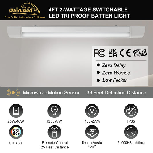 Walrusled 4FT Motion Sensor LED Tri Proof Batten Light, 2 Wattages/2 Lumens Selectable 20W/40W 2500lm/5000lm, 5000K, IP65, 100-277V, IK10, Dimmable 4 Foot LED Waterproof Vapor Tight Linear Tube Light Fixture, 120CM Flushmount Led Vapor Proof Ceiling Light