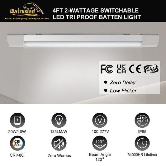 Walrusled 4FT Airport LED Tri Proof Batten Light 2 Wattages/2 Lumens Selectable 20W/40W 2500lm/5000lm, 5000K, IP65, IK10, 100-277V, 4 Foot Garage LED Waterproof Vapor Tight Linear Tube Light Fixture, 120CM Flush Mount Tunnel Led Vapor Proof Ceiling Light