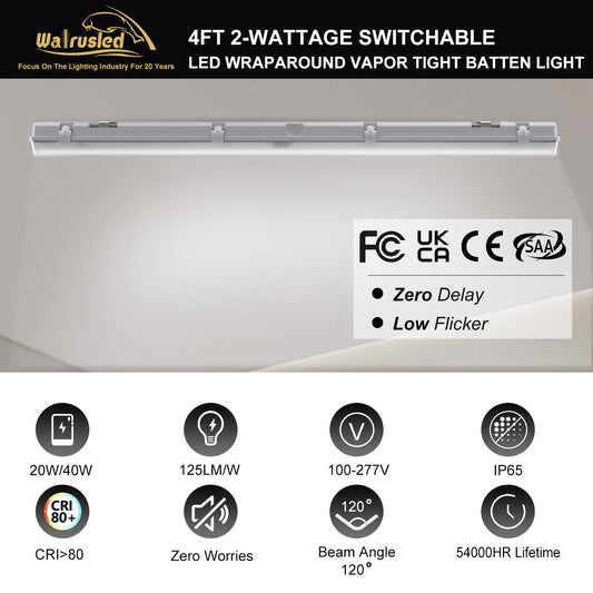 Walrusled 4FT Garage LED Wraparound Vapor Tight Batten Light 2 Wattages/2 Lumens Selectable, 20W/40W, 2500lm/5000lm, 5000K, IP65, 100-277V, 4 Foot Stairwell LED Wrap Waterproof Light Fixture, 120CM Flush Mount Tunnel Led Vapor Proof Batten Ceiling Light