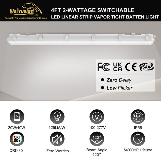 Walrusled 4FT LED Linear Strip Vapor Tight Batten Light 2 Wattages/2 Lumens Selectable, 20W/40W, 2500lm/5000lm, 5000K, IP65, 100-277V, 4 Foot Stairwell LED Tri Proof Pendant Light Fixture, 120CM Flush Mount Tunnel Led Vapor Proof Batten Ceiling Light