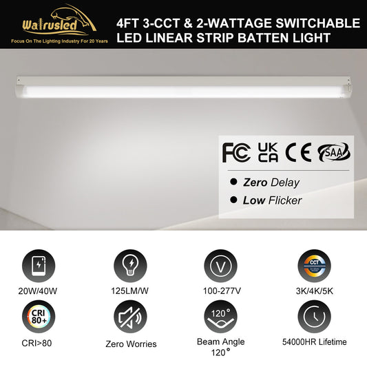 Walrusled 4FT LED Linear Strip Batten Light Fixture 2 Wattages/2 Lumens/3 CCT Selectable, 20W/40W, 2500lm/5000lm, 3000K/4000K/5000K, 100-277V, 4 Foot LED Shop Batten Pendant Light Fixture, Flush Mount Garage Workshop Hallway Stairwell Batten Ceiling Light