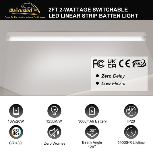 Walrusled 2FT LED Kitchen Linear Strip Emergency Batten Light, Power Selectable, 10W/20W, 1250lm/2500lm, Battery Backup, 5000K, 2 Foot LED Linear Strip Shop Light Fixture, 60CM Flush Mount LED Garage Workshop Spa Hallway Stairwell Ceiling Batten Light