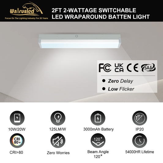 Walrusled 2FT LED Kitchen Wraparound Emergency Batten Light Fixture, Power Selectable 10W/20W, 1250lm/2500lm, Battery Backup, 5000K, IP20, 2 Foot LED Garage Wrap Around Batten Light Fixture, 60CM Flush Mount LED Closet Stairwell Patio Batten Ceiling Light