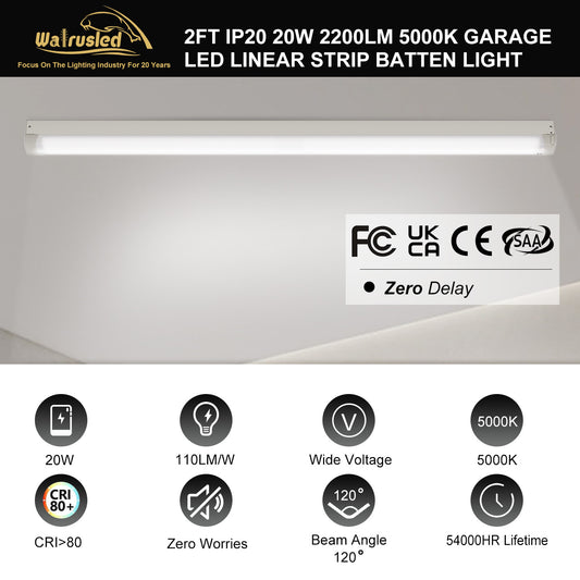Walrusled 2FT LED Kitchen Linear Strip Batten Light Fixture 2 Wattages/2 Lumens, 10W/20W, 1250lm/2500lm, 5000K, 100-277V, 2 Foot LED Shop Linear Strip Light Fixture, 60CM Flush Mount LED Garage Workshop Restaurant Hallway Stairwell Batten Ceiling Light