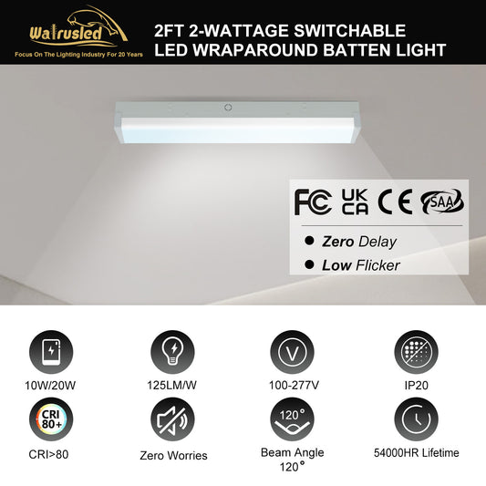 Walrusled 2FT LED Kitchen Wraparound Batten Light Fixture, 2 Wattages/2 Lumens/3 CCT Selectable, 10W/20W, 1250lm/2500lm, 3000K/4000K/5000K, 100-277V, IP20, 2 Foot LED Garage Wrap Around Batten Light Fixture, 60CM Flush Mount Stairwell Batten Ceiling Light