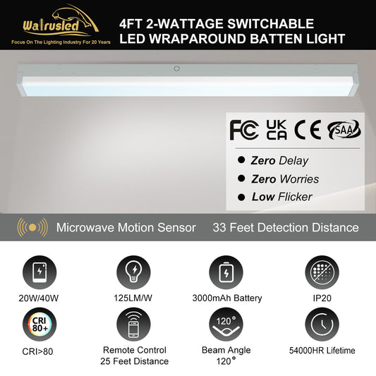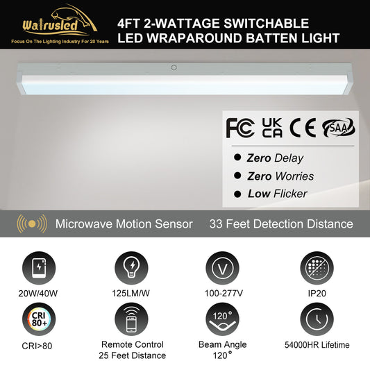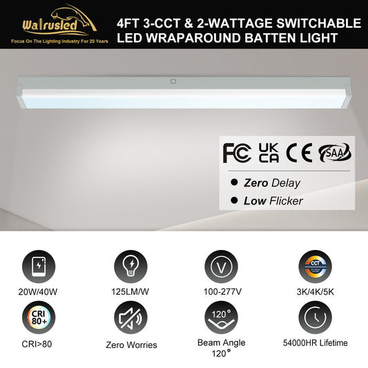 Walrusled 4FT LED Kitchen Wraparound Batten Light Fixture, 2 Wattages/2 Lumens/3 CCT Selectable, 20W/40W 2500lm/5000lm, 3000K/4000K/5000K, 100-277V, IP20, 4 Foot LED Garage Wrap Around Batten Light Fixture, 120CM Flush Mount Stairwell Batten Ceiling Light