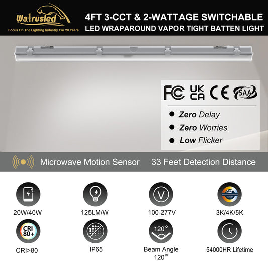 Walrusled 4FT Motion Sensor LED Wraparound Vapor Tight Batten Light, 2 Wattages/3 CCT Selectable 20W/40W 2500lm/5000lm 3000K/4000K/5000K, 100-277V, IP65, Dimmable 4 Foot LED Wrap Waterproof Light Fixture, 120CM Flush Mount Led Vapor Proof Ceiling Light
