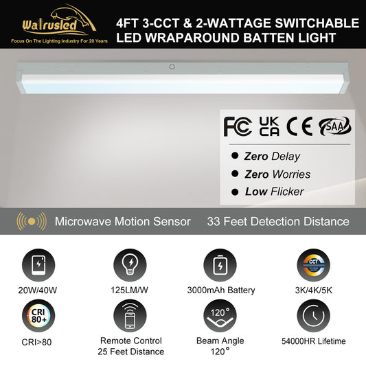 Walrusled 4FT Motion Sensor LED Wraparound Emergency Batten Light w/Remote, 3 CCT Power Selectable 20W/40W 2500lm/5000lm, Battery Backup, 3000K/4000K/5000K, IP20, Dimmable 4 Foot LED Office Wrap Batten Light Fixture, 120CM Flush Mount LED Ceiling Light