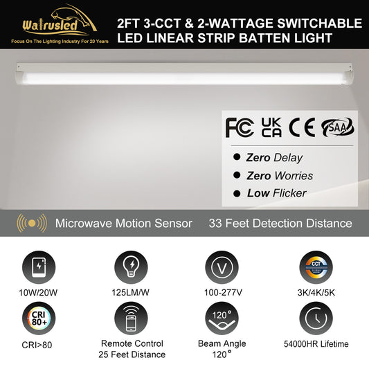 Walrusled 2FT Motion Sensor LED Linear Strip Batten Light with Remote, 2 Wattages/2 Lumens/3 CCT Selectable, 10W/20W, 1250lm/2500lm, 3000K/4000K/5000K, Dimmable 2 Foot LED Shop Batten Light Fixture, 60CM Flush Mount Garage Hallway Ceiling Batten Light