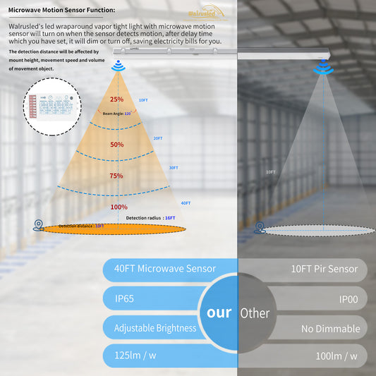 Walrusled 4FT Motion Sensor LED Wraparound Vapor Tight Batten Light, 2 Wattages/2 Lumens Selectable, 20W/40W, 2500lm/5000lm, 5000K, IP65, 100-277V, Dimmable 4 Foot LED Wrap Waterproof Light Fixture, 120CM Flush Mount Led Vapor Proof Batten Ceiling Light