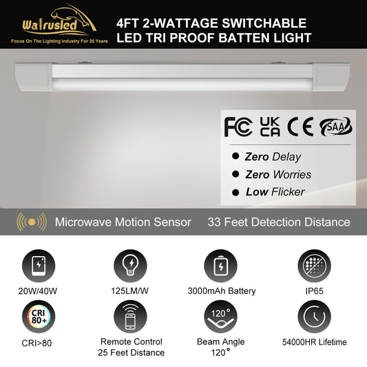 Walrusled 4FT Motion Sensor LED Patio Wraparound Emergency Batten Light w/Remote, Power Selectable, 20W/40W 2500lm/5000lm, Battery Backup, 5000K, IP20, Dimmable 4 Foot LED Office Wrap Around Batten Light Fixture, 120CM Flush Mount LED Garage Ceiling Light