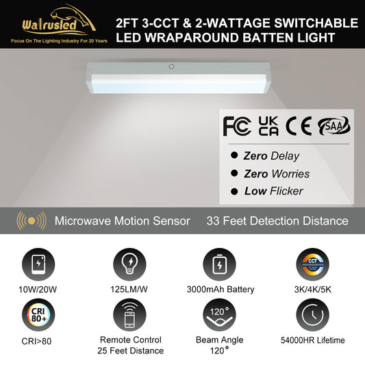 Walrusled 2FT Motion Sensor LED Wraparound Emergency Batten Light w/Remote, 3 CCT Power Selectable, 10W/20W, 1250lm/2500lm, Battery Backup, 3000K/4000K/5000K, IP20, Dimmable 2 Foot LED Office Wrap Batten Light Fixture, 60CM Flush Mount LED Ceiling Light