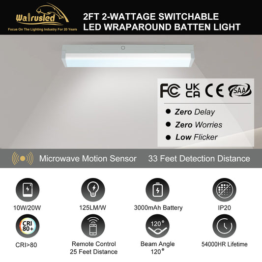 Walrusled 2FT Motion Sensor LED Stairwell Wraparound Batten Light with Remote, 2 Wattages/2 Lumens/3 CCT Selectable, 10W/20W 1250lm/2500lm, 3000K/4000K/5000K,100-277V, IP20, Dimmable 2 Foot LED Wrap Batten Light Fixture, 60CM Flush Mount LED Ceiling Light