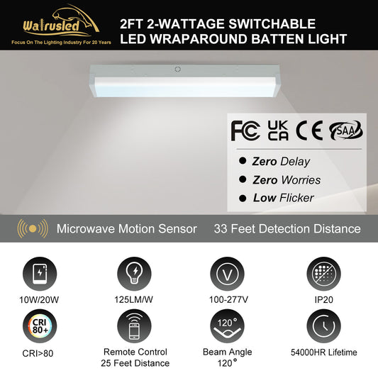 Walrusled 2FT Motion Sensor LED Stairwell Wraparound Batten Light with Remote, 2 Wattages/2 Lumens Selectable, 10W/20W, 1250lm/2500lm, 5000K, 100-277V, IP20, Dimmable 2 Foot LED Wrap Around Batten Light Fixture, 60CM Flush Mount LED Garage Ceiling Light