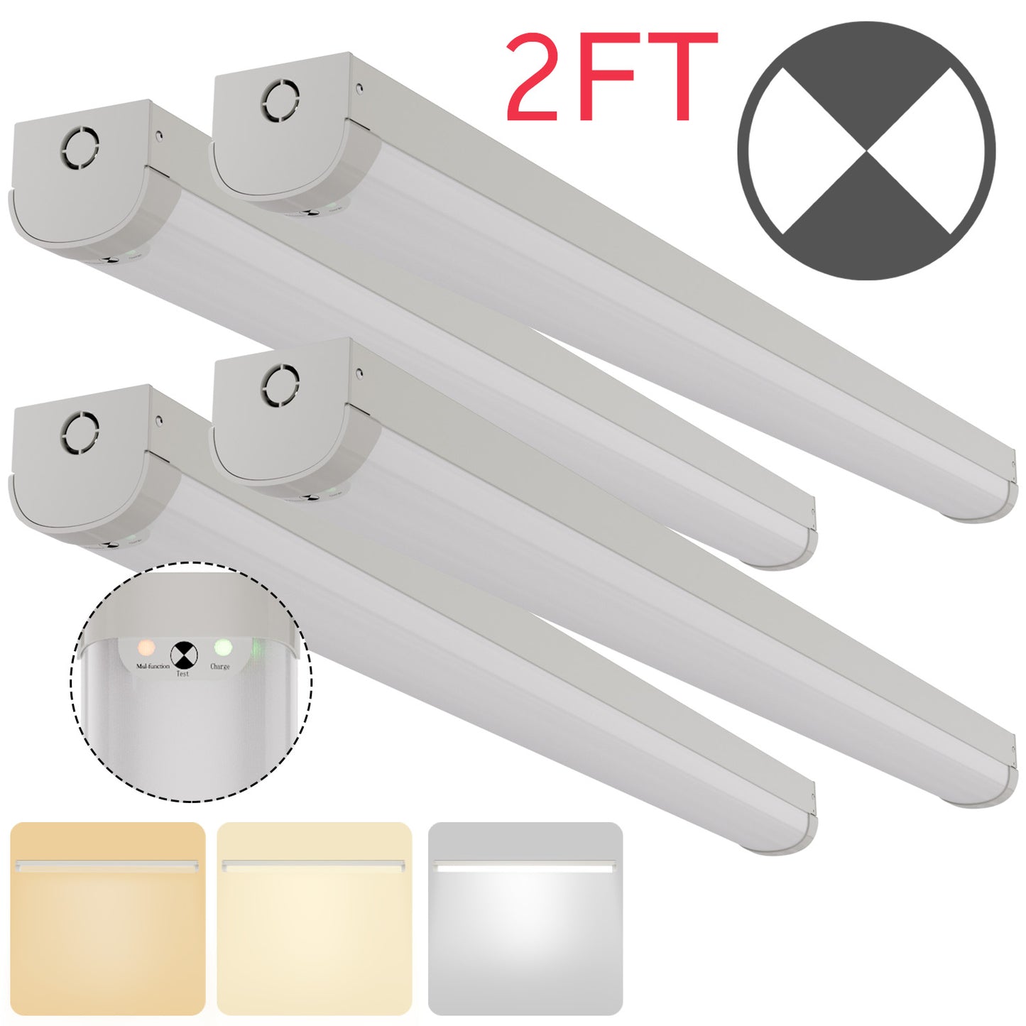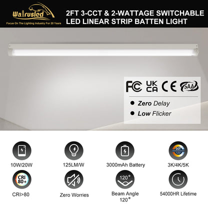 Walrusled 2FT Hallway LED Linear Strip Emergency Batten Light, 3 CCT Power Selectable, 10W/20W, 1250lm/2500lm, Battery Backup, 3000K/4000K/5000K, 2 Foot LED Linear Strip Shop Light Fixture, 60CM Flush Mount Garage Workshop Stairwell Ceiling Batten Light