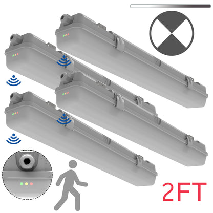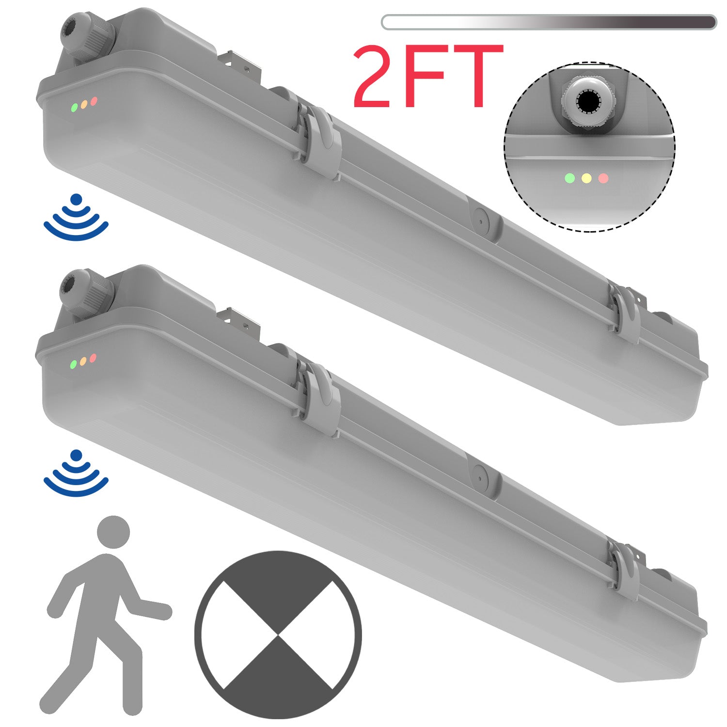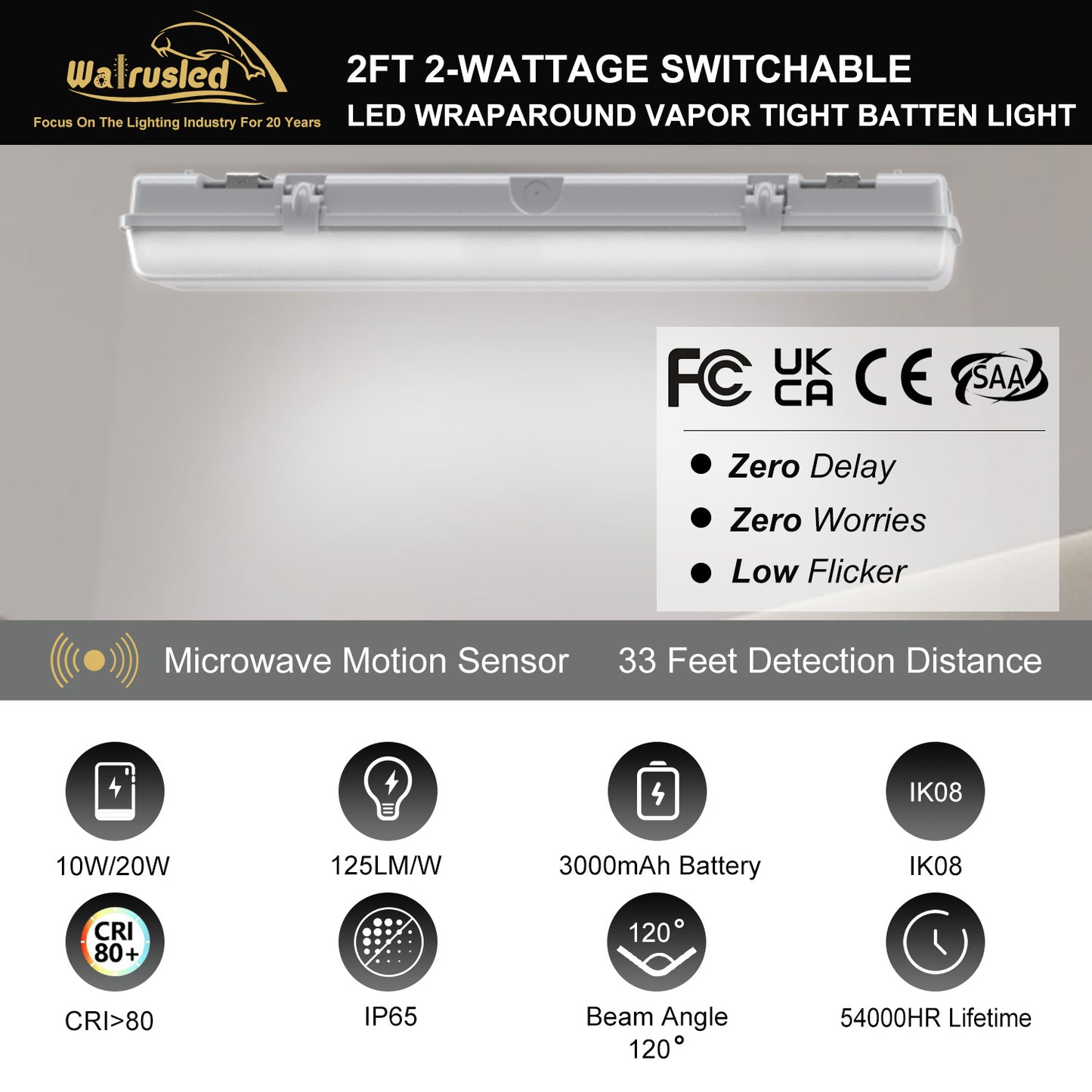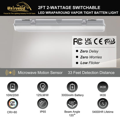 Walrusled 2FT Motion Sensor LED Wraparound Vapor Tight Emergency Batten Light, Power Selectable, 10W/20W, 1250lm/2500lm, Battery Backup, 5000K, IP65, IK08, Dimmable 2 Foot LED Wrap Waterproof Light Fixture, 60CM Flush Mount Led Vapor Proof Ceiling Light
