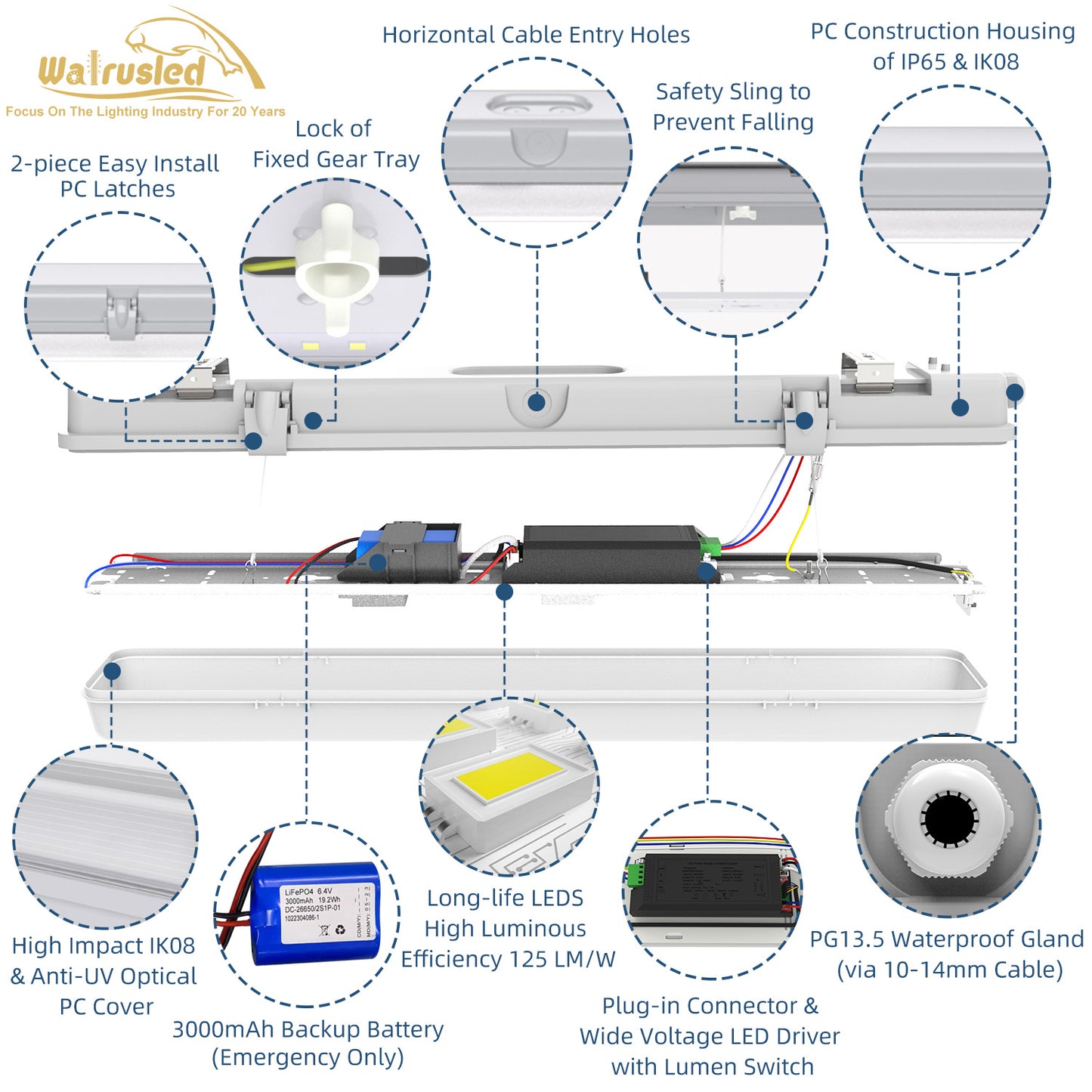 💡 【POWER SELECTABLE & BUILT-IN BATTERY BACKUP】 Walrusled 2 foot led car wash vapor tight batten light fixture with 2 wattages (10W / 20W) and 2 brightness levels (1250lm / 2500lm). The 10W setting will offer 1250 lumens, 20W will offers 2500 lumens. Different lumens meet different usage scenarios. Backup battery can last over 300 minutes with LiFePO4 battery 6.4V/3000mAh, 16 to 24 hours charging time, test switch and indicators light. Battery charge/discharge automatically while power is on or off.