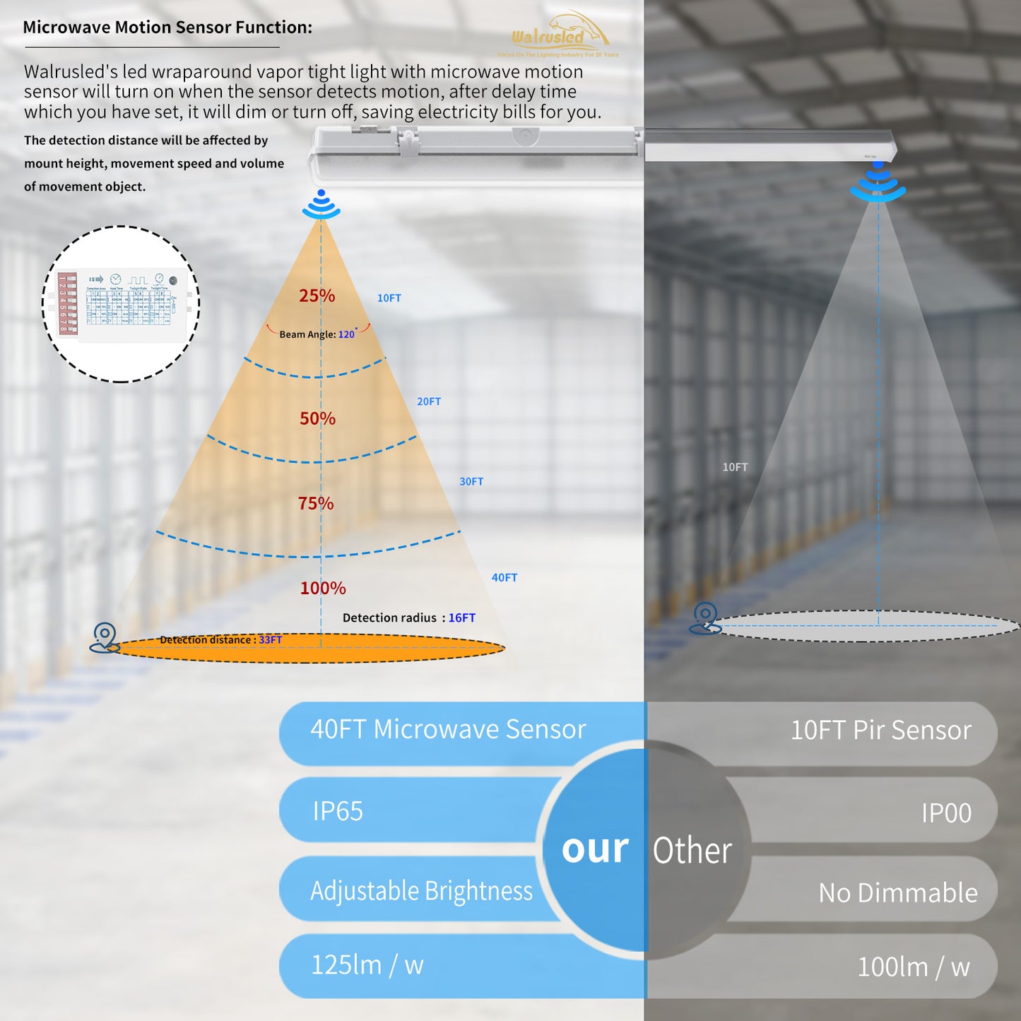 💡 【TRI-LEVEL MICROWAVE SENSOR】 Walrusled 24 Inch led stairwell wraparound vapor tight batten light fixture comes with intelligent sensor. Tri-level microwave sensor allows the fixture to dim or turn off after a period of time when no motion is detected. Twilight brightness can be choosen 20%, 40%, 60% or 100%. Hold time can be choosen 30S-∞. The microwave sensor can detect motion distance within a maximum of 33 feet. You can adjust its sensing range, hold time, stand-by brightness percentage and stand-by time according to your preference.